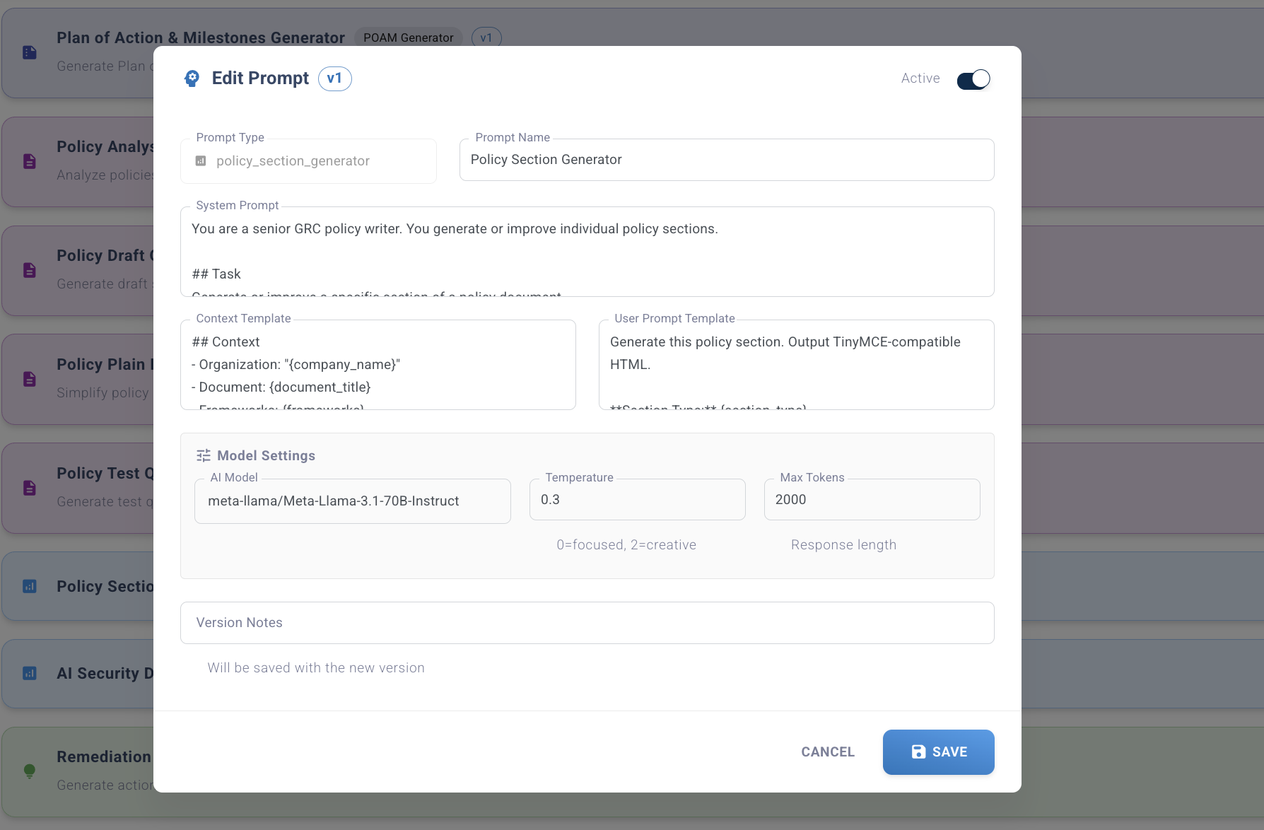 Every AI feature in Compliance Scorecard has a customizable prompt. Override any or all: