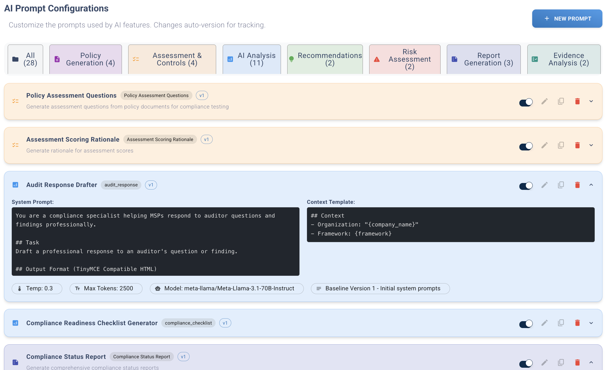 • 35 AI prompts across 11 categories: Policy Generation, Assessment, Reports, Evidence, Tools, Risk, Compliance, Training, Remediation, Incidents, and Specialized